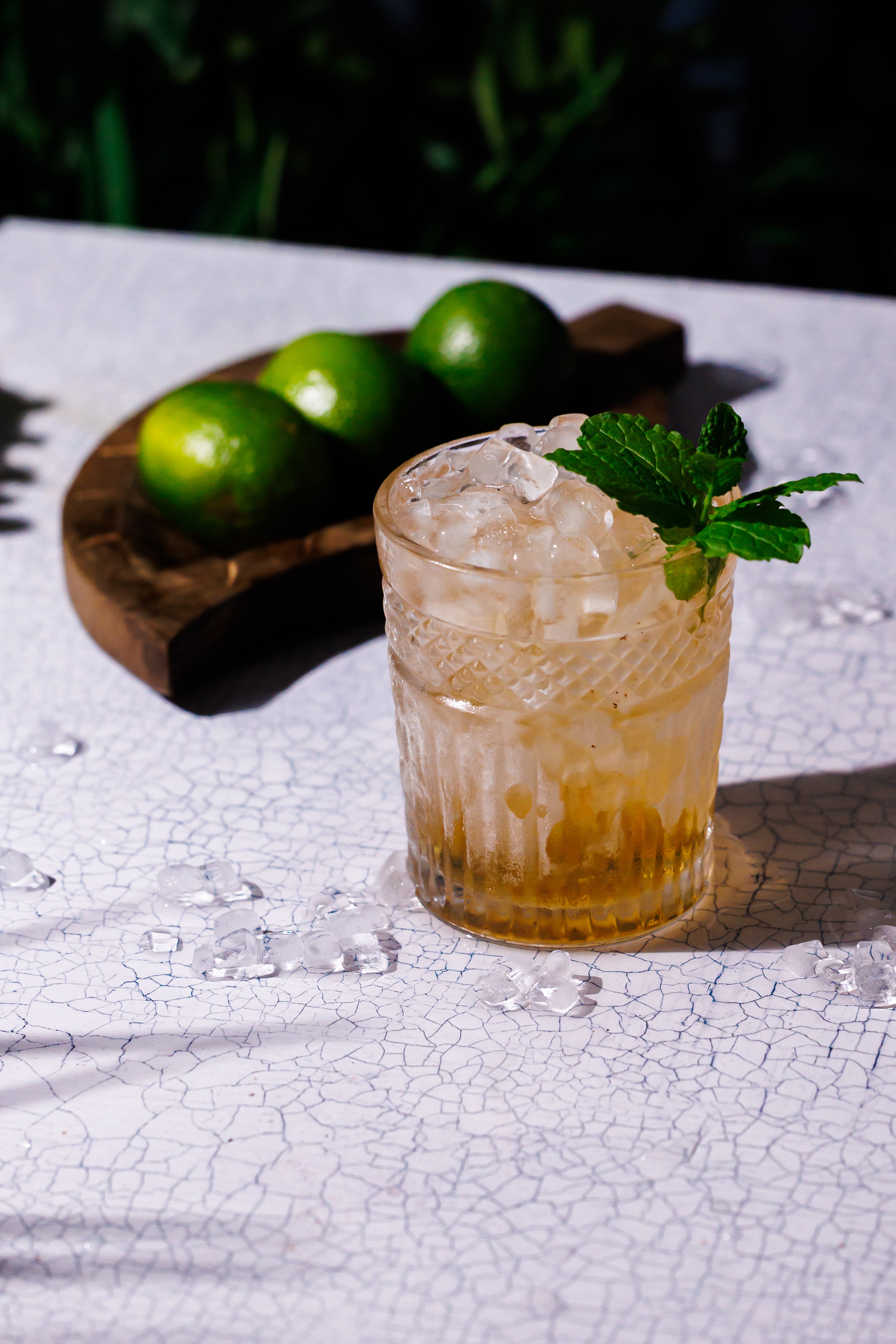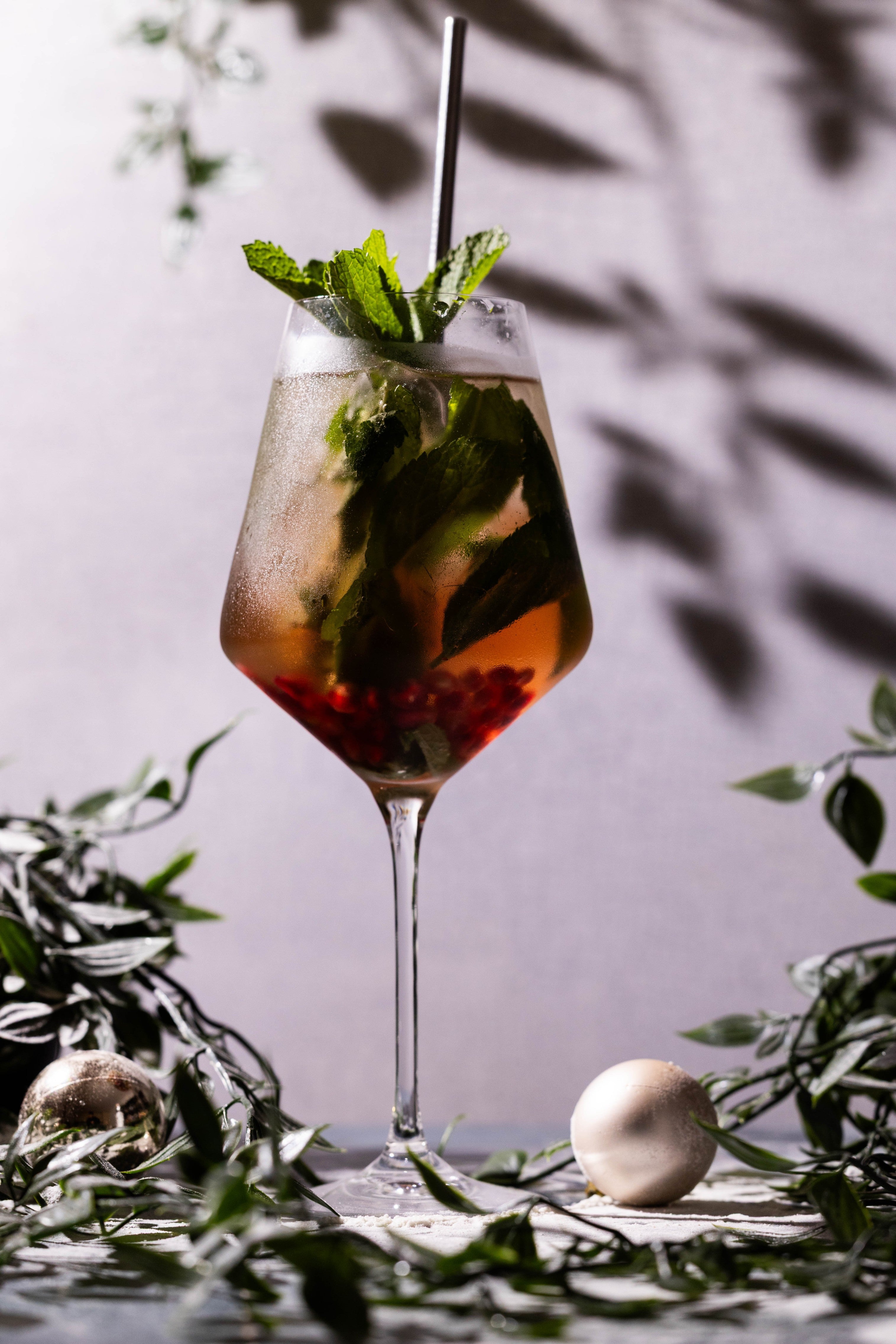 Add all to a glass with ice then add soda water. Garnish with mint, lemon or cucumber.
